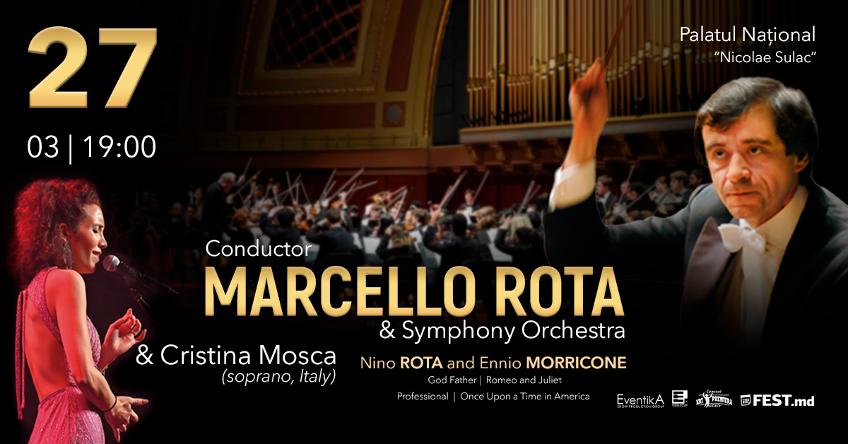 Orchestra simfonică, sub bagheta maestrului Marcello Rota, nepotul marelui Nino Rota, va prezenta un concert dedicat celor doi genii ale căror creații răsună în inimile a milioane de oameni — Nino Rota și Ennio Morricone.