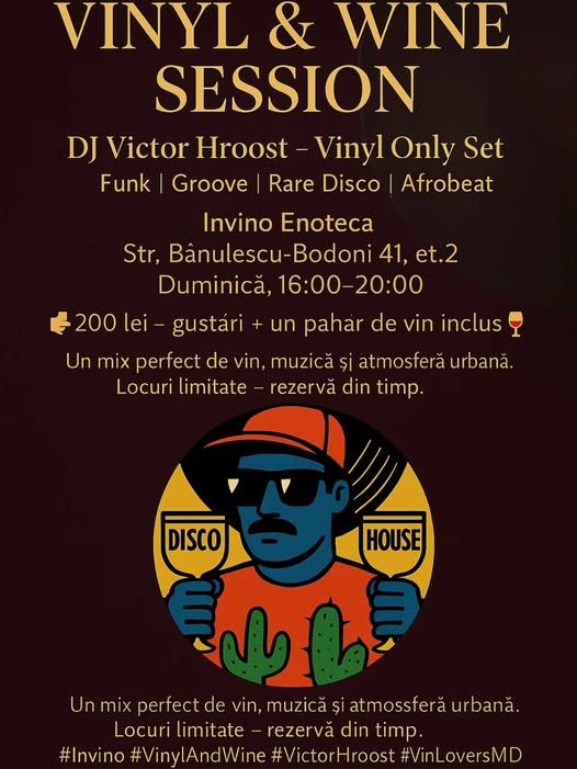 Duminica aceasta, între 16:00 și 20:00, Invino Enoteca se transformă într-un lounge de vin și muzică, cu DJ Victor Hroost și o selecție unică de viniluri – de la rare disco până la funk și afrobeat.