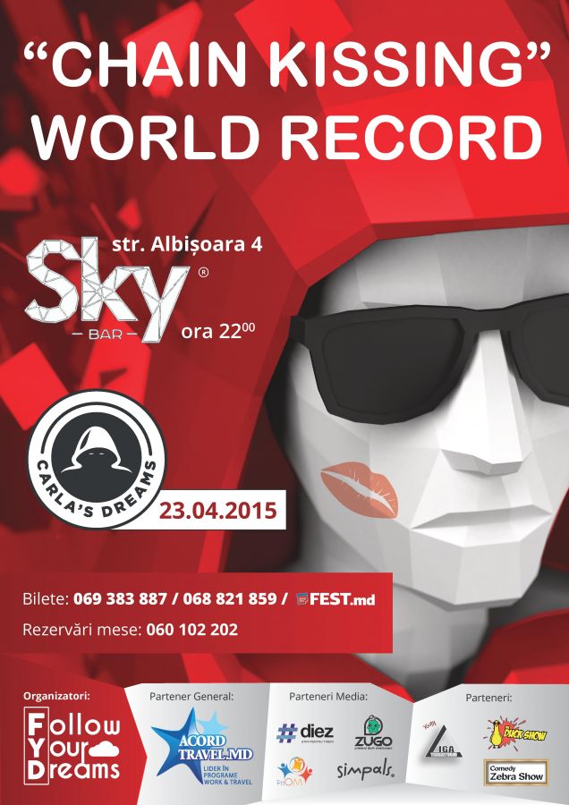 Joi, 23 aprilie, ora 22:00 în incinta clubului Sky Bar va fi bătut un noi record mondial ''Kissing-Chain'' care va fi înregistrat în Lista de Recorduri Mondiale, vei fi prezent la un eveniment și de muzica LIVE cu Carla's Dreams și Dara.
