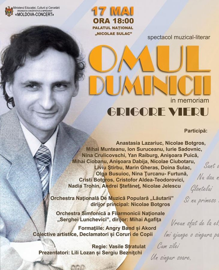 OCI ,,Moldova - Concert” cu susţinerea Ministerului Educației, Culturii și Cercetării Vă invită, la spectacolul OMUL DUMINICII în Memoria poetului neamului nostru- Grigore Vieru .