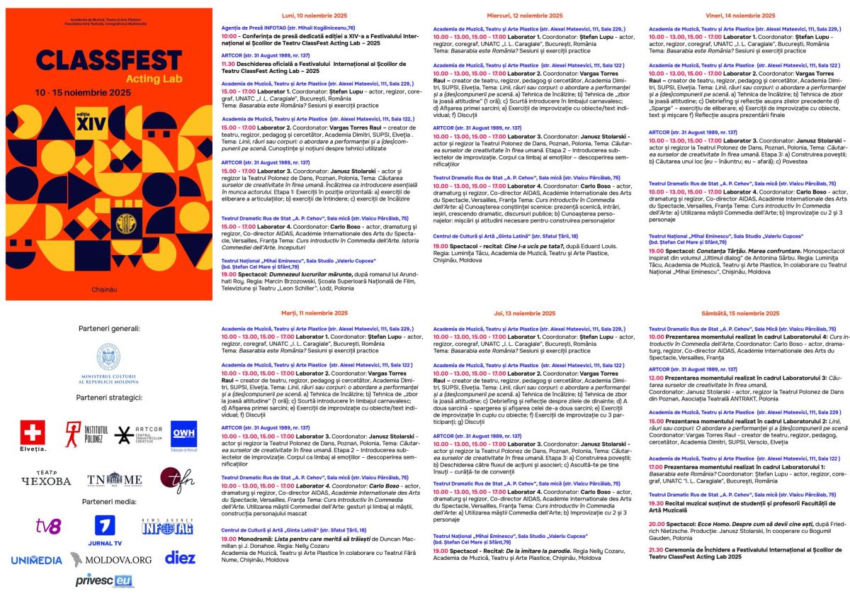 Astfel, în perioada 10.11-15.11.25 la Chișinău, va avea loc ClassFest Acting Lab - o extensie a Festivalului Internațional al Școlilor de Teatru și Film care pune accent pe procesul de învățare și creație artistică. Motto-ul acestui proiect este CLASSFEST – spațiu de educație teatrală și experiment. Evenimentele sunt dedicate dezvoltării abilităților studenților printr-o serie de laboratoare susținute de profesori și regizori invitați, culminând cu o prezentare performativă work-in-progress. Patru regizori-profesori vor crea Laboratoare cu patru grupuri de studenți. Fiecare grup va lucra sub îndrumarea unui profesor, experimentând diverse tehnici de actorie, dramaturgie și colaborare colectivă.