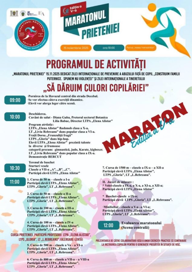Primăria Chișinău anunță că, pe 15 noiembrie, începând cu ora 10:00, în Parcul „Valea Trandafirilor”, elevii și profesorii se vor reuni într-o atmosferă plină de culoare, entuziasm și solidaritate, pentru a alerga pentru prietenie, bunătate și bucuria de a fi împreună.