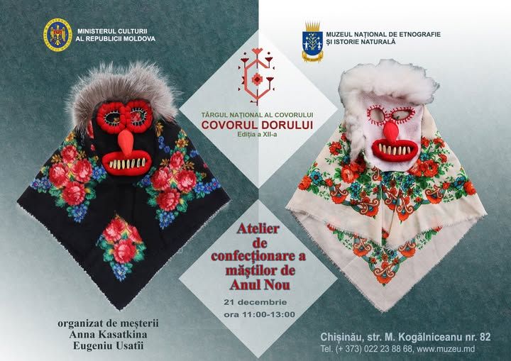 Pe data de 21 decembrie, ora 11:00-13:00, Muzeul Național de Etnografie și Istorie Naturală anunță organizarea unui atelier de confecționare a măștilor specifice sărbătorilor de iarnă, ce va avea loc în cadrul Târgului Național al Covorului „Covorul Dorului”, ediția a XII-a. Activitatea se va desfășura sub egida meșterilor populari Anna Kasatkina și Eugen Usatîi.